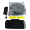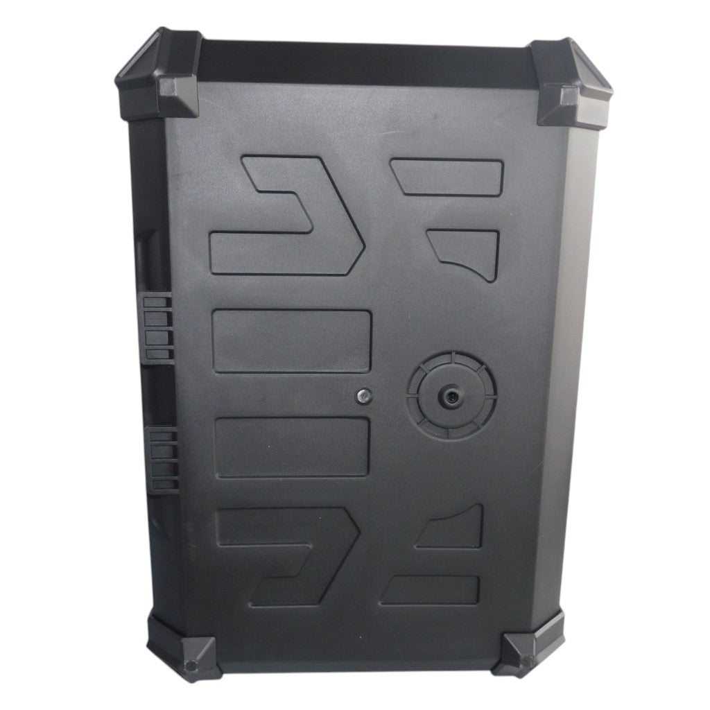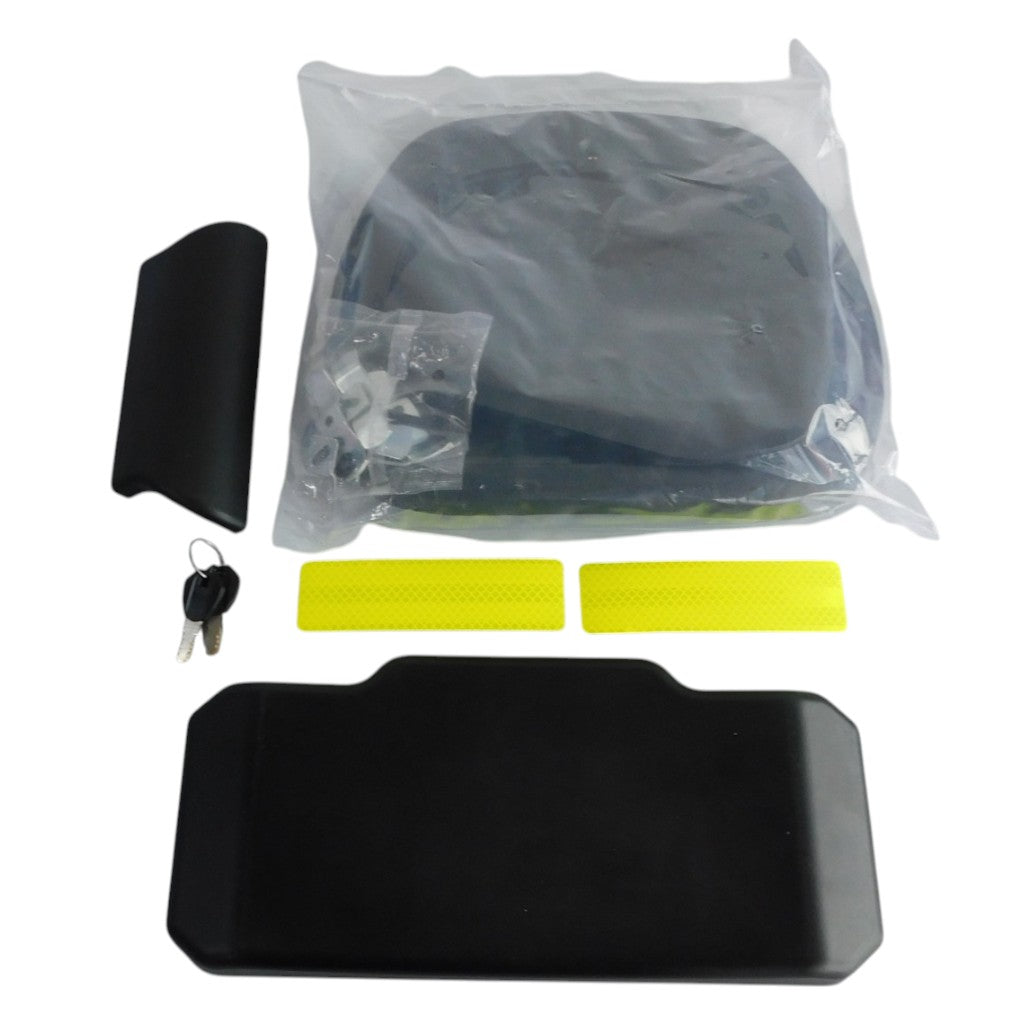 Externo: Respaldar superior, base de instalación en plástico con sistema de fácil liberación, agarraderas superiores aluminio, llavín de seguridad en aluminio, 2 llaves, tornillería para su instalación y 2 reflectivos adhesivos.
