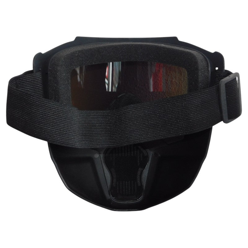 Máscara con gafas integradas estilo táctico, diseñada para motociclistas que buscan protección, comodidad y un look agresivo. Combina lentes oscuros con filtro UV y una máscara desmontable que protege el rostro del polvo, viento e insectos, ideal para recorridos urbanos o de aventura. Su diseño ergonómico y correa ajustable permiten un ajuste seguro en todo tipo de cascos abiertos o tipo cross.