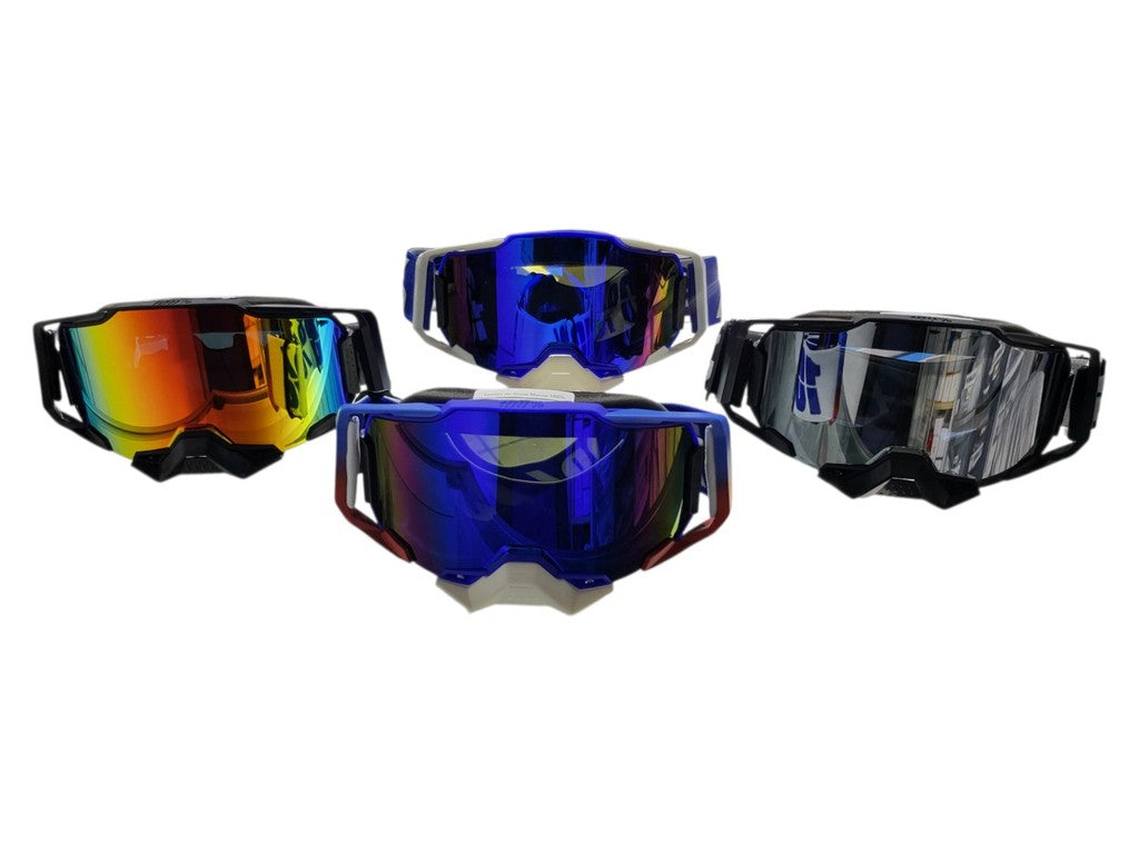 Lentes Cross 100% como motocross o MTB. Marco mate flexible, lente iridiscente con UV. Correa ajustable con patrón y logo "100%" para ajuste cómodo.