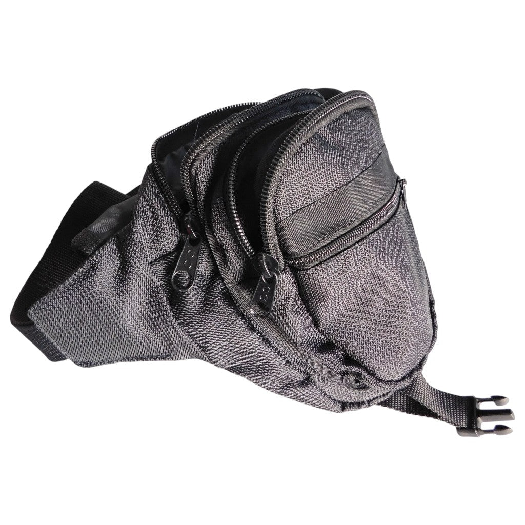 Externo: Compartimento principal con cierre durable, bolsillo adicional para accesorios pequeños, correas ajustables a muslo y cintura con broches de liberación rápida.